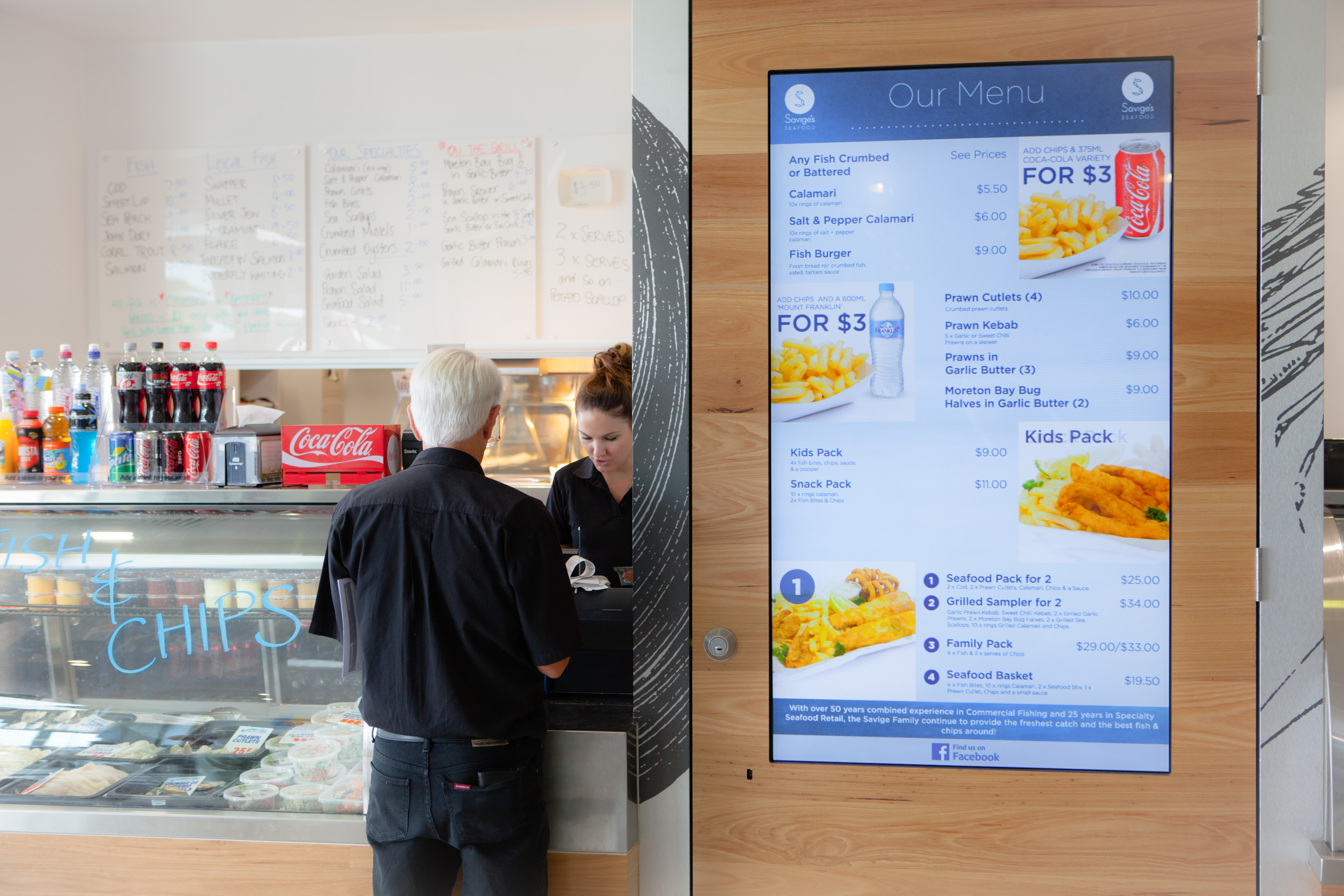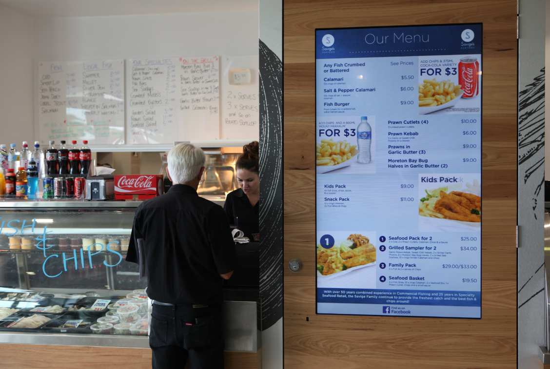 Savige’s Seafood Digital Menuboards Savige’s Seafood, a popular local fish & chip shop, wanted to save time & costs on updating their menu boards by implementing digital. We deployed two displays; one 65″ and one 46″, both featuring animated menus & daily specials. Client: Savige's Seafood Website: facebook.com Services: Content, Hardware, Software, Installation, Support